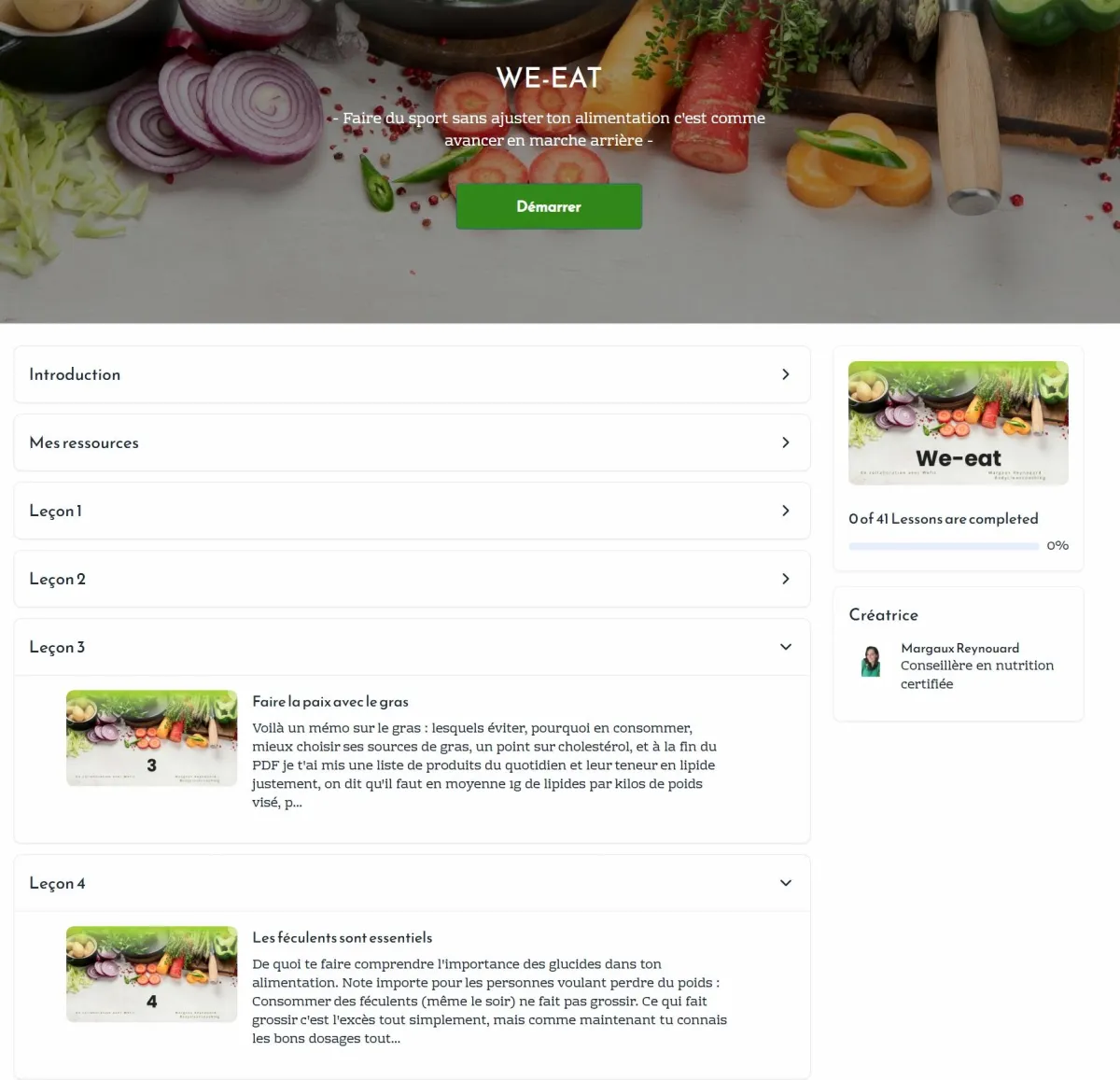 Concrètement, dès ton adhésion au programme tu auras accès à une plateforme en ligne avec accès à des outils concrets qui t'aideront à reprendre les bases de la nutrition (nombreux audios, PDF, fiches mémos téléchargeables, recettes, menus)